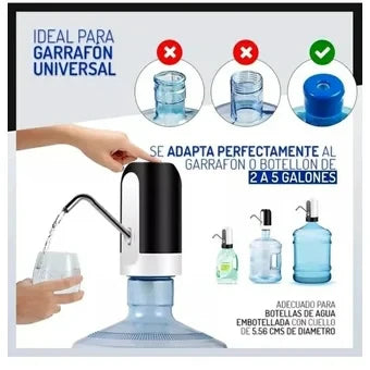 Bomba de agua automática.Dispensador eléctrico recargableAlimentado por USBMaterial libre de BPA. Duradero y reutilizable100% seguro para el consumo de aguaPuede bombear 4-6 jarras de agua si está completamente cargadaFácil uso para niños y ancianosInterruptor encendido / apagadoSe adapta a botellas con tapa de rosca 4.5L - 19LPequeño y ligero.Ideal para usar en casa o en la oficinaTiempo de carga: 3-4 horas